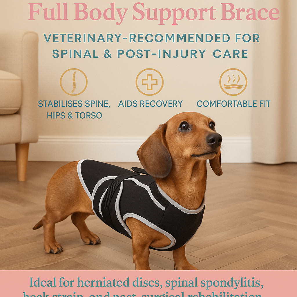 A premium, vet-recommended full body support brace designed to stabilise your dog’s spine, hips, and torso – ideal for aiding recovery from herniated discs, spinal spondylitis, back strain, and post-surgical rehabilitation.