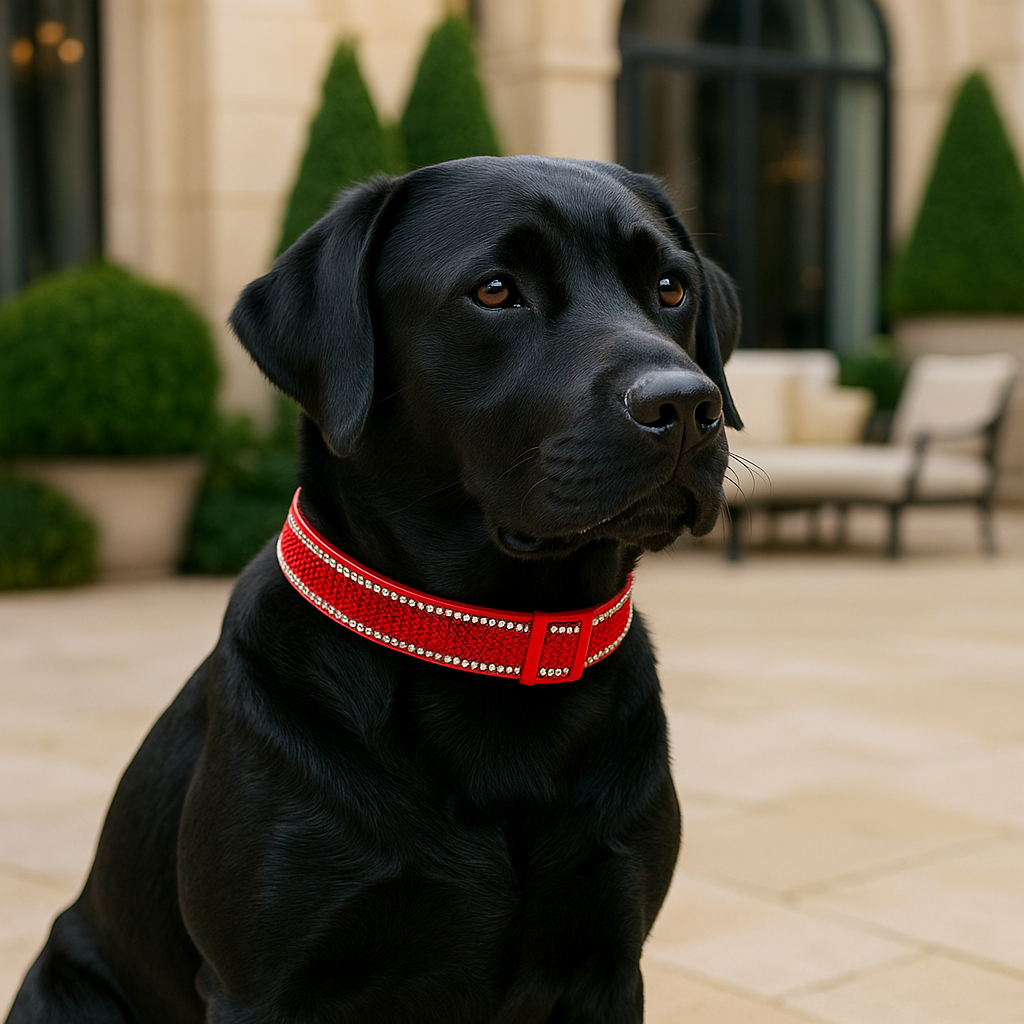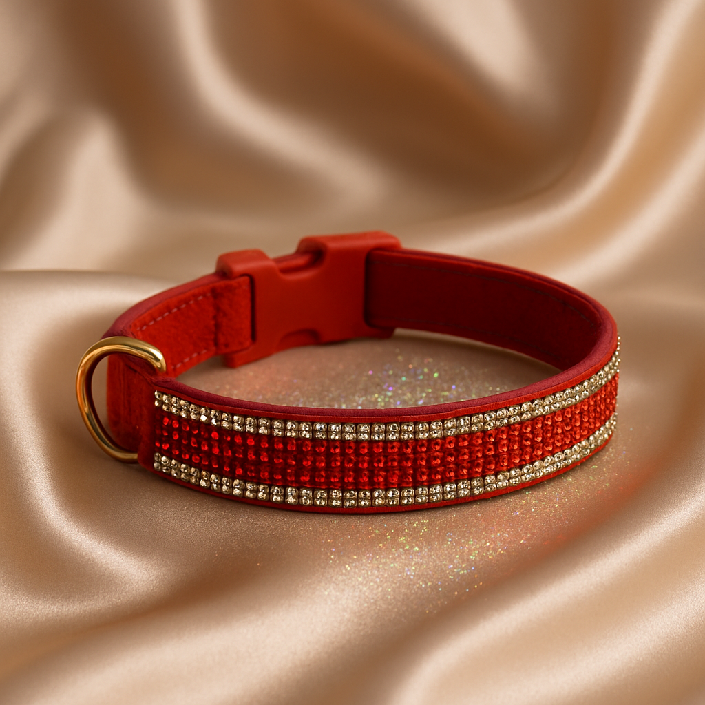 This glamorous collar features three rows of high-shine crystals set against a bold red faux-leather band, giving an ultra-premium, eye-catching look. The reflective shimmer catches the light beautifully, making your dog stand out in style — whether it’s a daytime walk or a special outing.